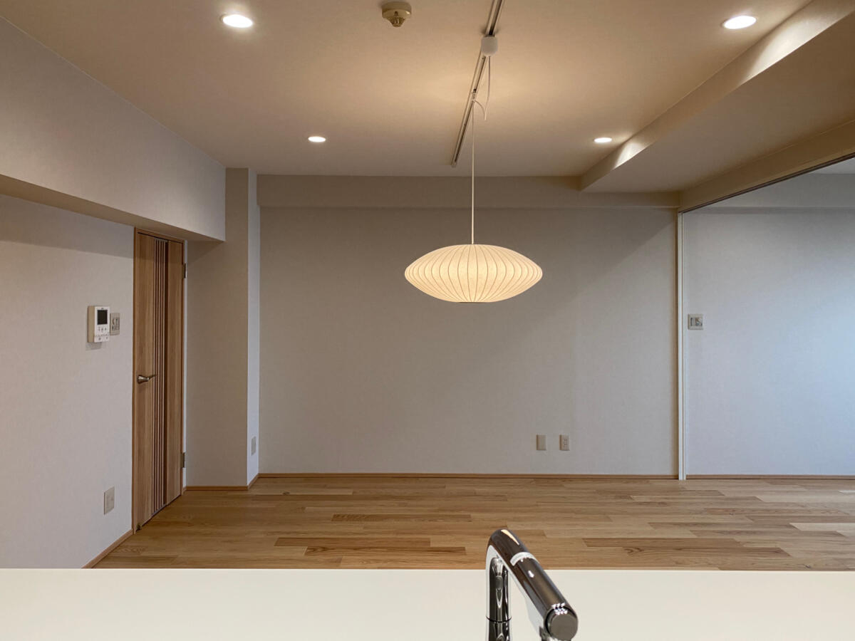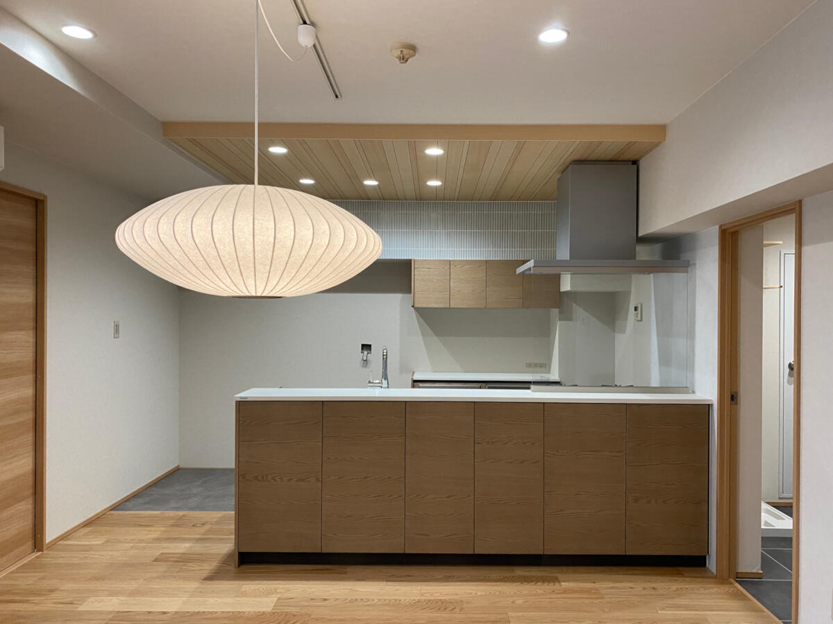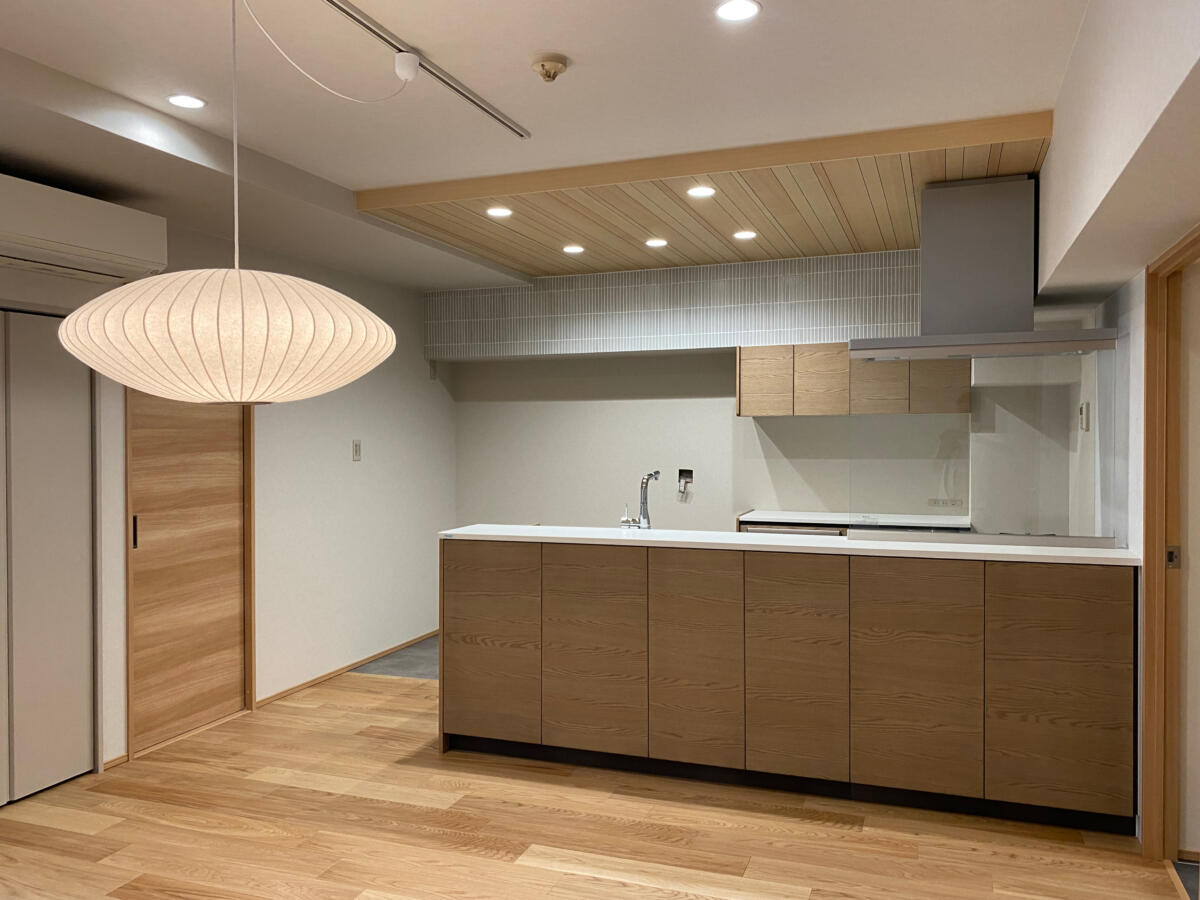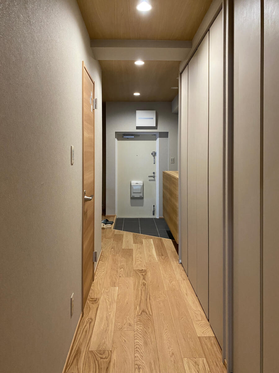 今回は弊社ホームページのお問い合わせフォームからお越しいただいたお客様です。 現在お住まいのマンションのリノベーションです。同じマンションの一室に一旦仮住まいをされ、リノベーションを行いました。こちらのマンションは私が小学生の時に建ったマンションで、当時は華やかでオシャレで、今で言うショッピングモールも兼ね備えたマンションでした。今のマンションよりも分譲面積が大きく、お部屋も広めの造りです。お客様とも何度もお打合せさせて頂き、少し和のイメージを取り入れたいとの事で、フローリングや天井材、建具など、意欲的に色々なメーカーのショールームに出向かれ、使う素材をお決め頂きました。大きな問題も無く、無事にお引き渡し出来ました。