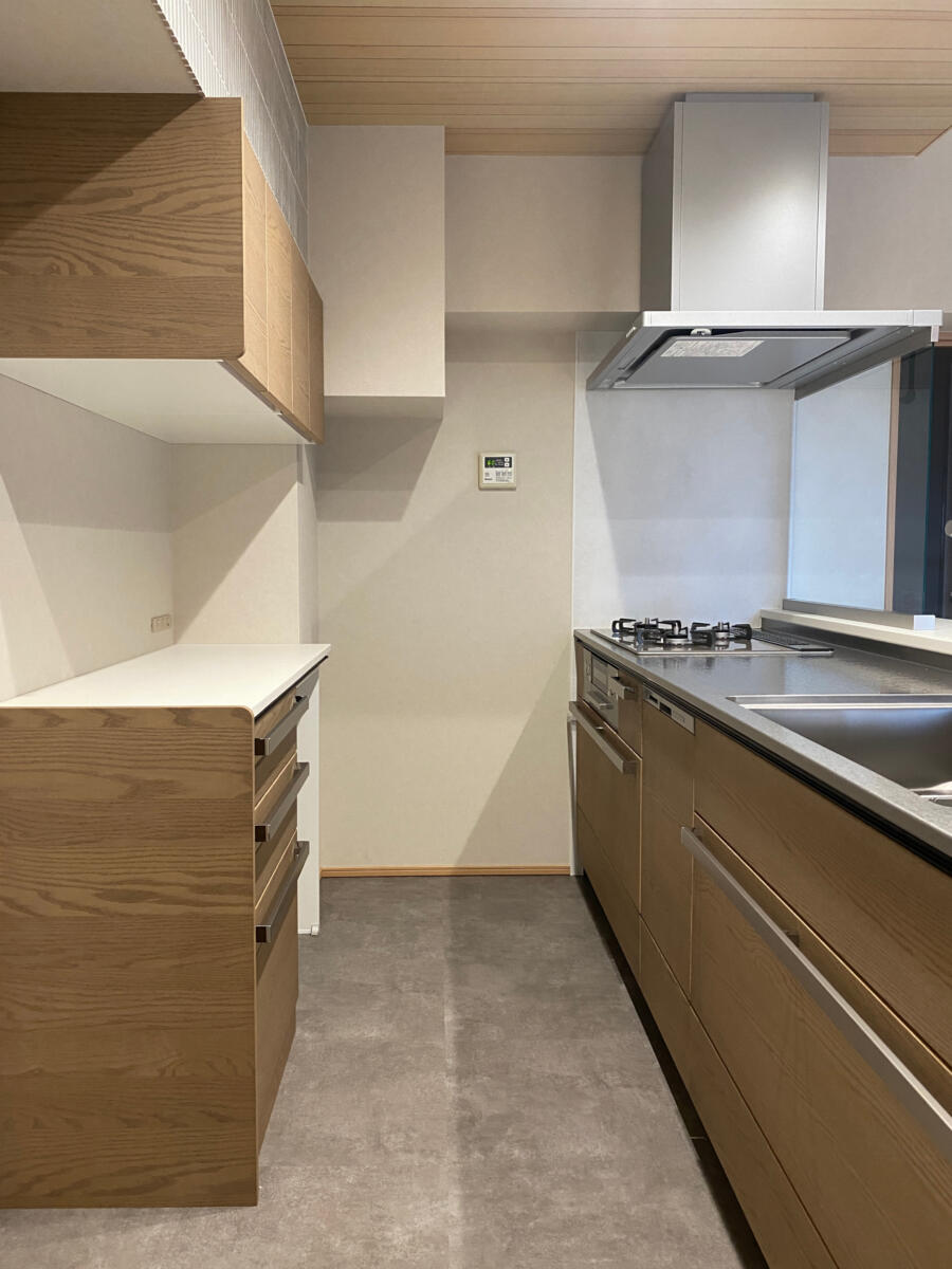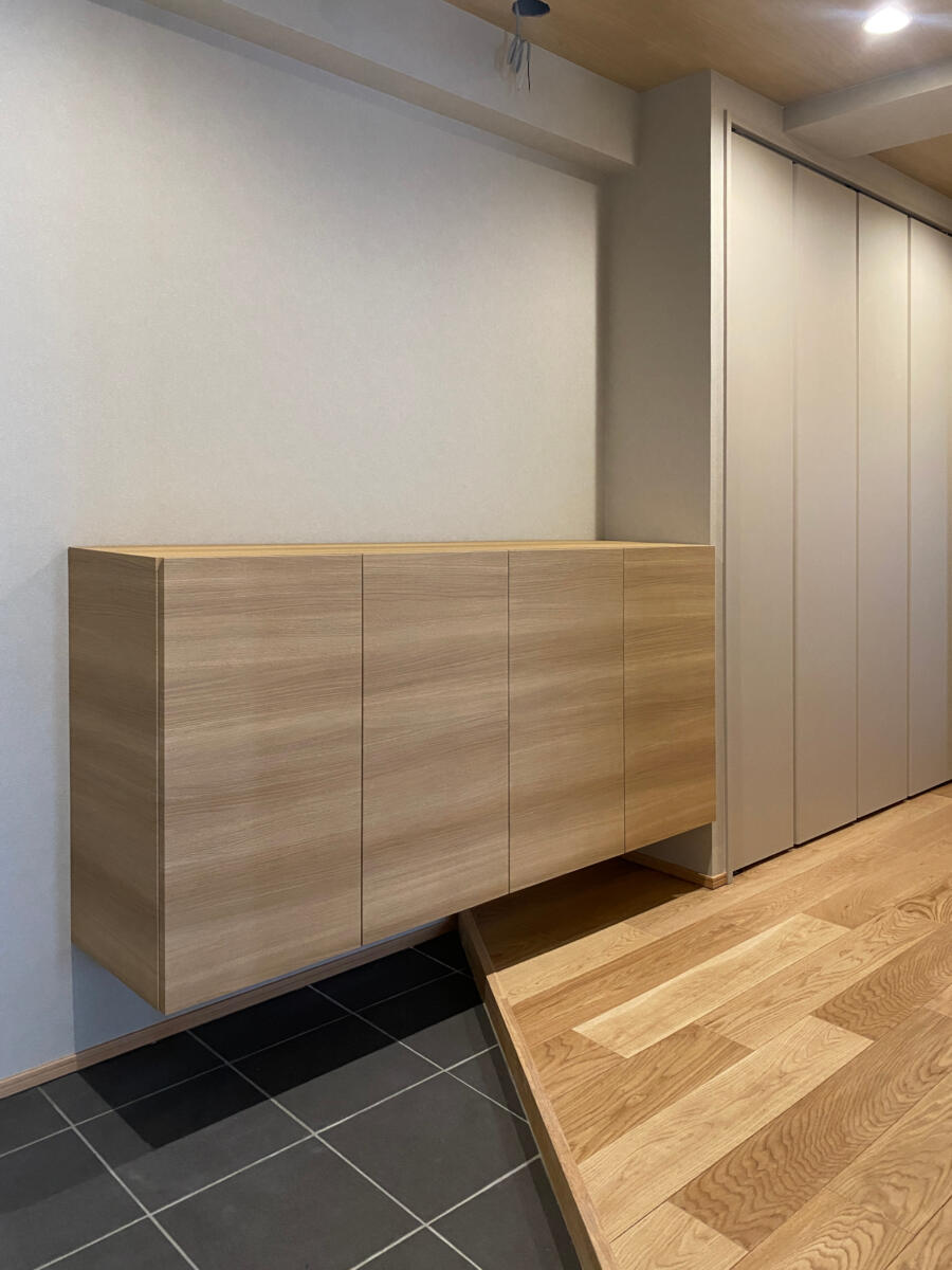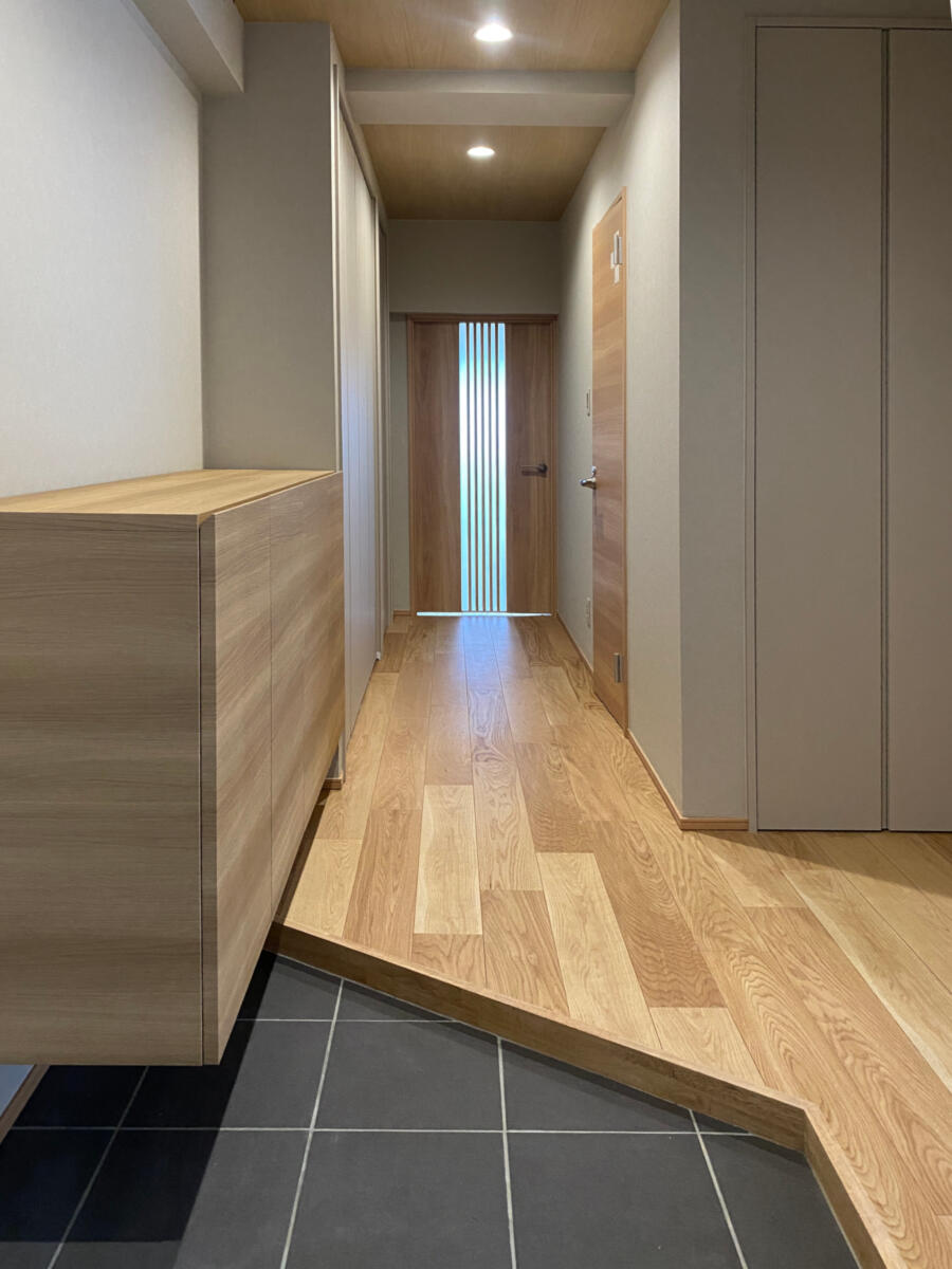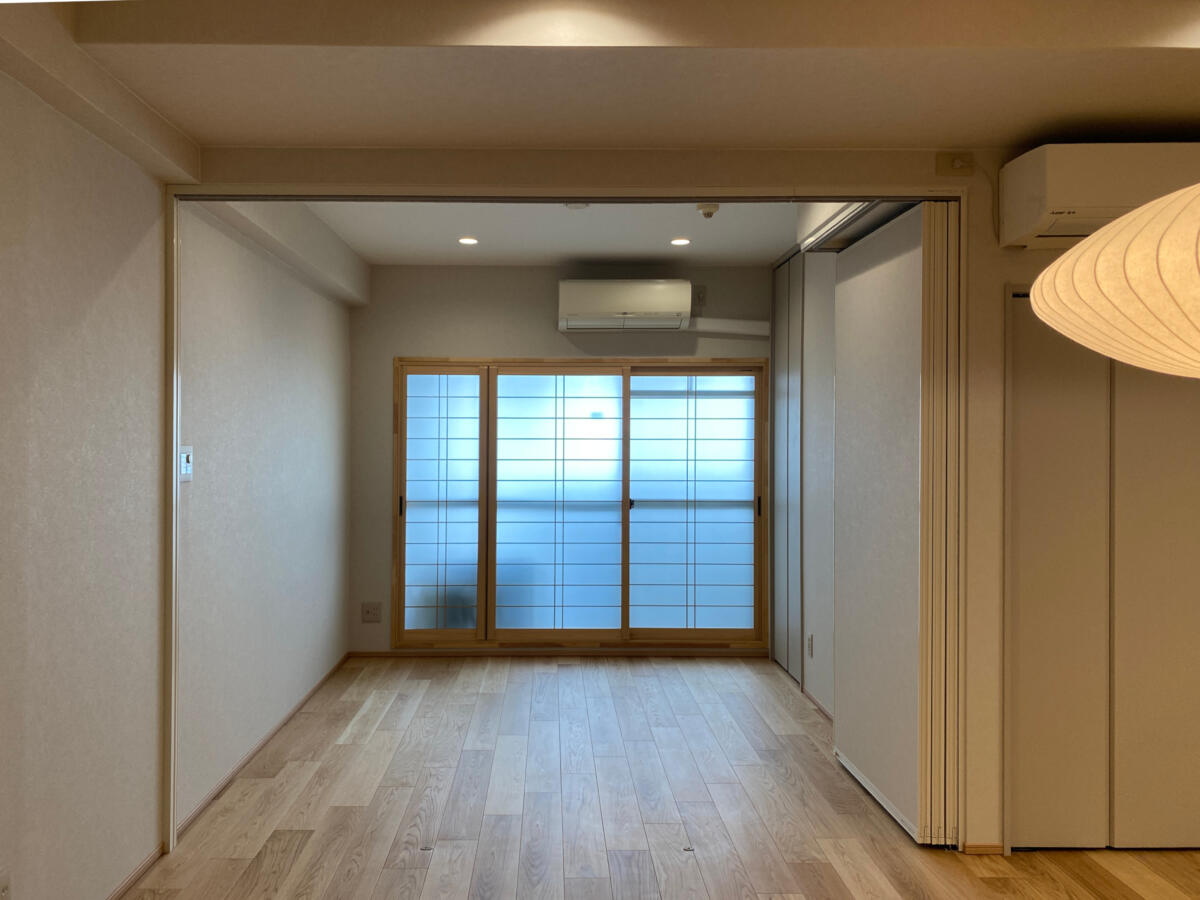 今回は弊社ホームページのお問い合わせフォームからお越しいただいたお客様です。 現在お住まいのマンションのリノベーションです。同じマンションの一室に一旦仮住まいをされ、リノベーションを行いました。こちらのマンションは私が小学生の時に建ったマンションで、当時は華やかでオシャレで、今で言うショッピングモールも兼ね備えたマンションでした。今のマンションよりも分譲面積が大きく、お部屋も広めの造りです。お客様とも何度もお打合せさせて頂き、少し和のイメージを取り入れたいとの事で、フローリングや天井材、建具など、意欲的に色々なメーカーのショールームに出向かれ、使う素材をお決め頂きました。大きな問題も無く、無事にお引き渡し出来ました。